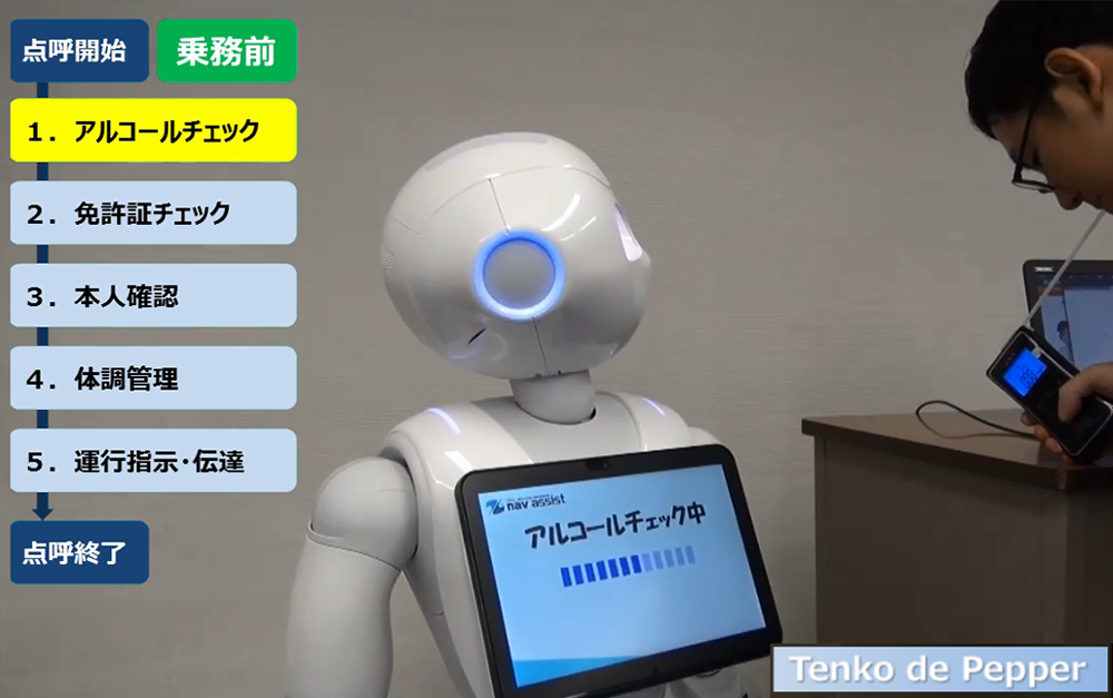PepperがIoT機器やAIと連携し、運送業における点呼業務(アルコールチェック、本人確認、体調管理、運行指示,危険運転予測など)を行い、運行管理者を支援します。