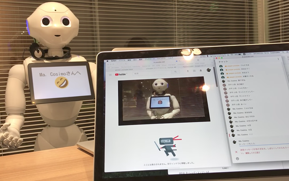 Youtube LiveにPepperが登場! 視聴者がYoutubeを通してコメントを送るとそれに対応した会話や動作をPepperがしてくれます。雑談APIで基本的な会話を可能にし、感情解析APIでPepperの苦手な感情表現にも挑戦しました。 展望としてはYoutuberとして色んな挑戦をさせたり、商品紹介などLIVE ECとしての実用性も期待しています。