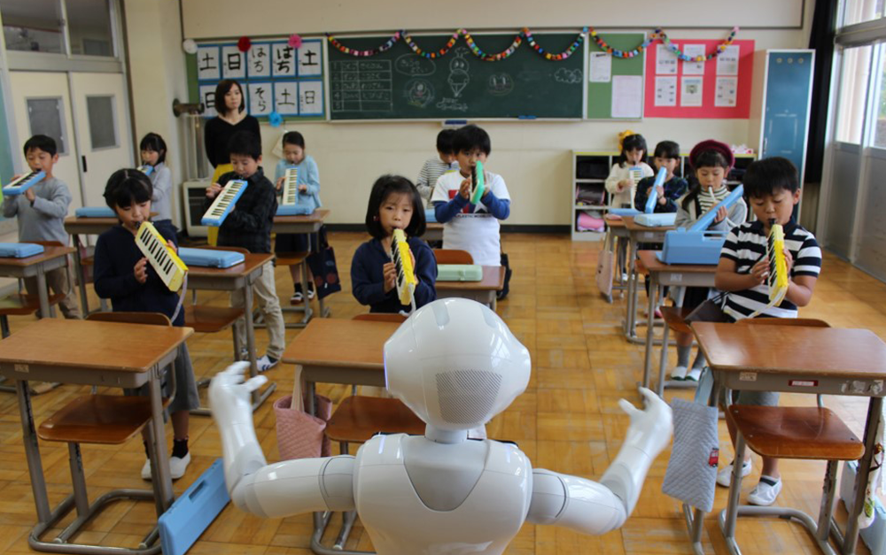 PepperがAI(顔認識、話者認識)と、IoT(静電容量センサーと組み込んだピアニカ)と連携して、小学生の音楽の授業をサポートします。 クラス全員で一斉に演奏した場合でも、Pepperが個別に演奏データを採点します。教師はPepperから連携された情報を参考にして、よりきめ細かい指導が行えるようになります。また児童1人で練習も可能で、点数出しながら、楽しんで個別練習が可能になります。