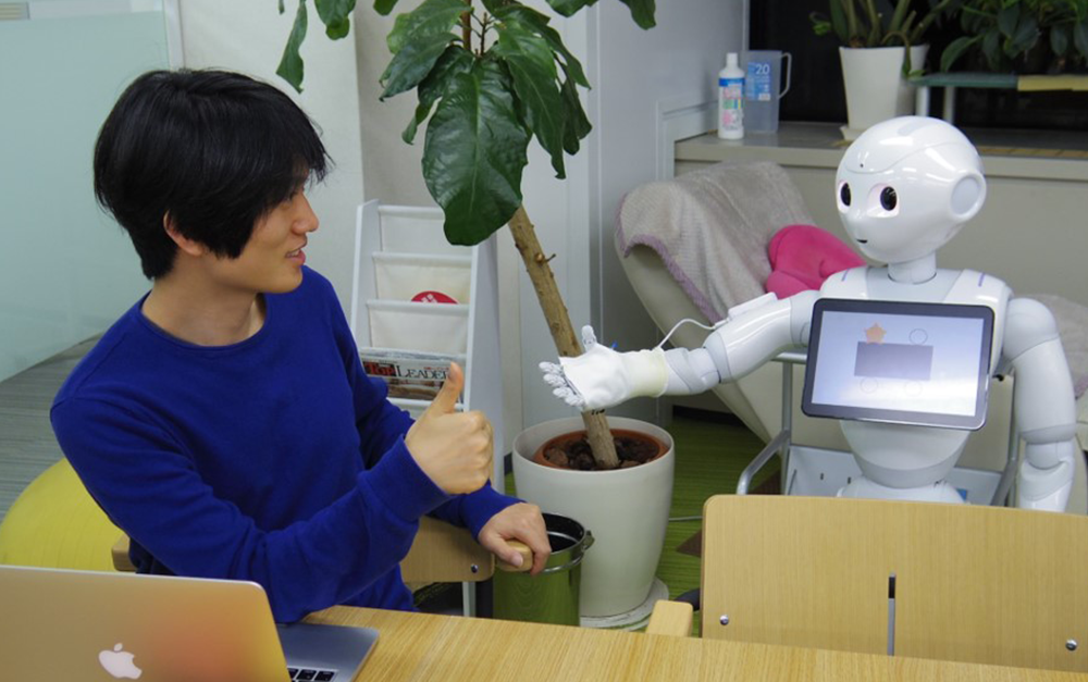 Moti Pepperとは、Motivation Pepperの略で、働き方改革が叫ばれる中、企業内でPepperが様々なIoT機器、ロボット、人工知能と連携することで、職場環境を改善し、社員の健康とモチベーションアップにより、企業全体としての生産性を向上させるアプリです。